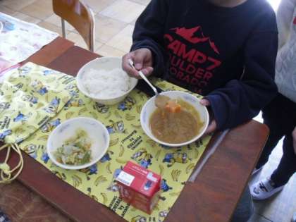 給食室でカレーに星形のにんじんを入れ,教室で見つけてもらいました。