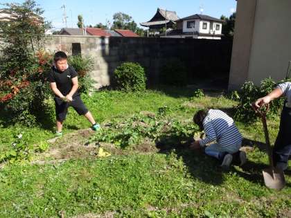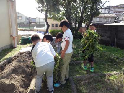 総合の学習で畑の草抜きをしました。大根の収穫に向けて周りの草を協力しながら抜きました。終わると畑がとてもきれいになっていました。これから大根が大きくなるようにお世話を頑張っていきたいと思います。