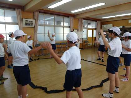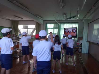 合同運動会に向けて準備体操やバルーンの練習をしました。曲はみんながよく知っているパプリカです。リズムに合わせて動きを確認し,しっかりと練習することができました。