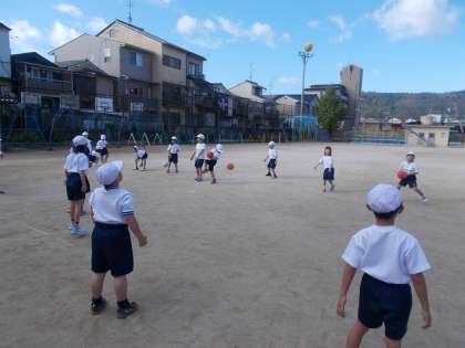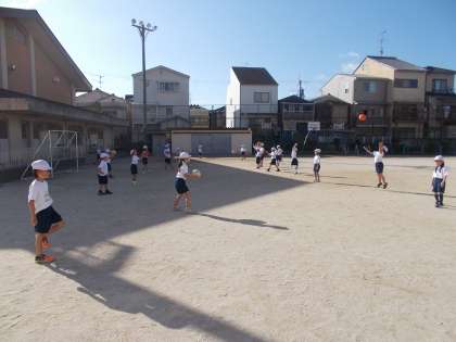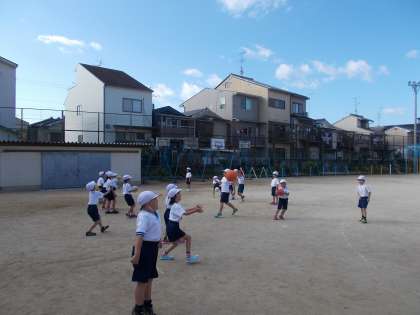 もうすぐ体育でパスゲームを行います。ゲームが楽しくできるよう,ボールを使って基礎的な運動を行いました。両手でパス,片手でパス,ドリブルなどいろいろな運動をお友達と一緒に行いました。うまく相手にキャッチしてもらえると,嬉しそうな子どもたちでした。