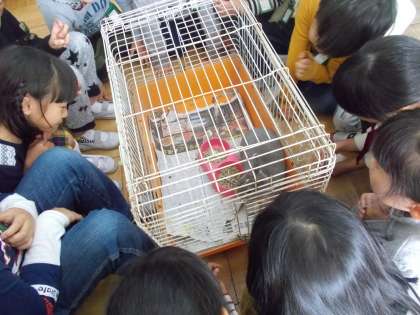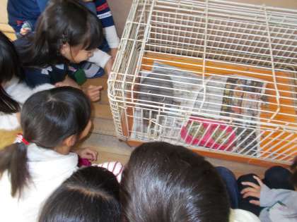 「いきものとなかよくなろう」の学習で,今日は学校にいる二羽のうさぎが教室にやってきました。子どもたちは触れ合うのがとても楽しみで,じっくり観察した後,優しくうさぎを触っていました。「さらさらの毛だなあ。」「あったかい!」と,嬉しそうに話していました。