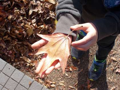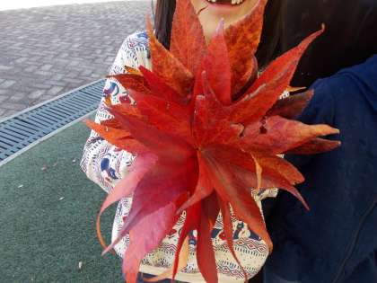 公園の遊具で一生懸命遊ぶ子どもたちの横で,秋見つけの続きをしている子どもたちもいました。「てのひらと同じ大きさだったよ!」「ブーケみたい!」と,落ちた葉で楽しそうに遊んでいました。