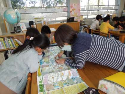 今度は,地域の方が作られた地図「西梅津ルート」,「東梅津ルート」を使って梅津の昔の様子を調べています。
