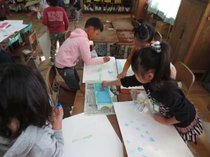 図工「うつしたかたちから」の学習で,いろいろな物を使ってスタンプをしました。