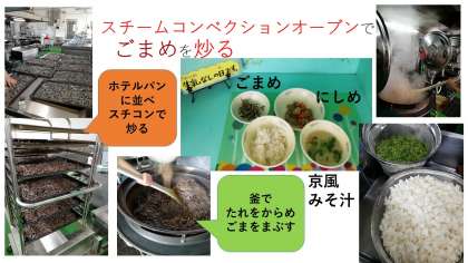 最近のスチコン調理としては,ほうれん草のソテーのコーンを蒸す,ごまめのすぼしを炒るなどです。