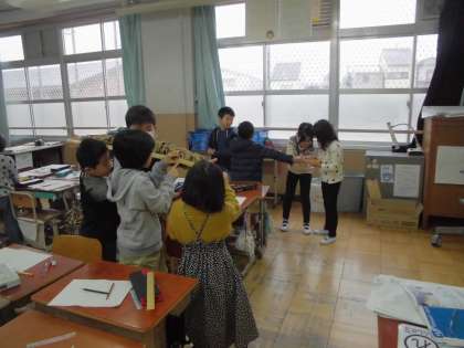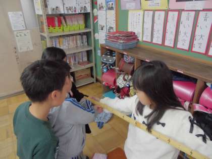 算数では100cmをこえる長さの学習が始まっています。1mのものさしを使って,両手を広げた長さを計りました。子どもたちは,30cmのものさしも同時に使いながら,友達と協力して活動することができました。