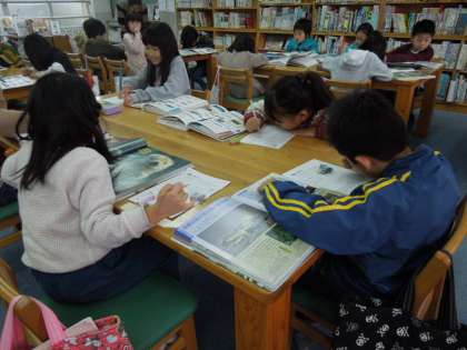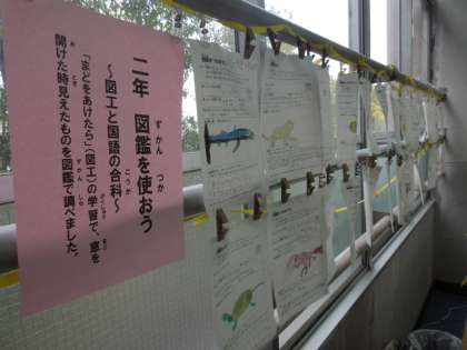2学期に引き続いての学習です。本の「書名,ラベル,ページ数」を書いておくと,続きの学習にスムーズに取り組めました。今回は,クラスごとにワークシートをほんのもりに掲示していきます。