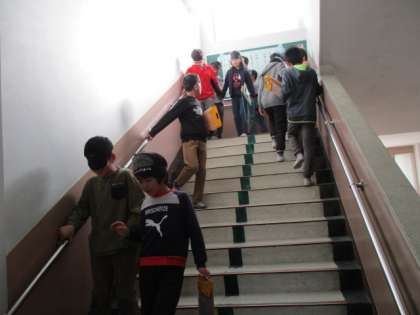まず,アイマスクをして筆箱から鉛筆を出したり,自分の名前を書いたりしました。普段何気なくやっていることができないという声が上がりました。階段の昇り降りをする時には,補助する人の腕を持ったり,手すりを持ったりしてこわごわ体験する人もいました。補助することの難しさを実感した人もいました。