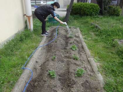 3月にみんなでうえたジャガイモの芽が出て,緑の葉っぱが広がってきました。これからどんどん伸びて土の中の新しいお芋がそだっていきます。しゅうかくが楽しみです。