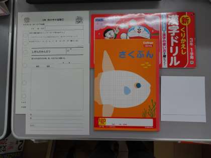 きのうと今日,先生たちでおうちに新しいしゅくだいをとどけました。しゅくだいは,上のしゃしんの5つです。中をたしかめて,毎日少しずつとりくんでくださいね。新しいドリルやノートには名前を書いておきましょう。