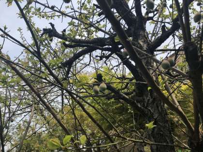 桜の木は花びらが散り,葉桜になってきましたが,桜よりも一足早く満開していた学校の梅の木には,小さなウメの実が…!