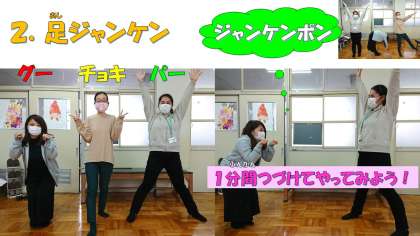 足を閉じて「グー」,足を前後に開いて「チョキ」,足を左右に開いて「パー」。ジャンケンポンで1分間連続で足ジャンケンをしてみましょう。体もつけると楽しいです。