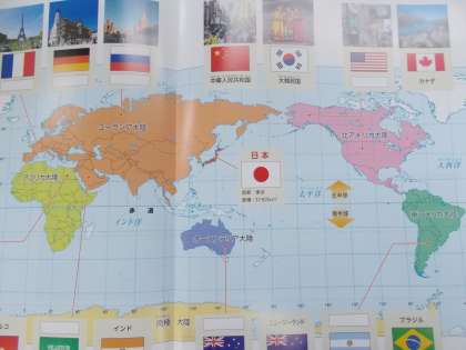 さて,新しい教科書はみなさん見ましたか?今日は社会科の教科書から世界地図をとってきました。上の写真が,みんなの教科書にのっている世界地図です。そして…下の写真,これも世界地図なのですが…何かがちがうぞ…いったい,どこがちがうでしょうか。よーく見て,考えてみてください。(ちなみに,くるっと向きをひっくり返したわけではありません。)