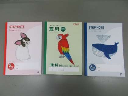 学校が始まったらみんなで使うノートが届きました。かわいいイラストがかいてあります。どれがどの教科でしょうか。まだほかのノートもあるので,楽しみにしておいてくださいね。