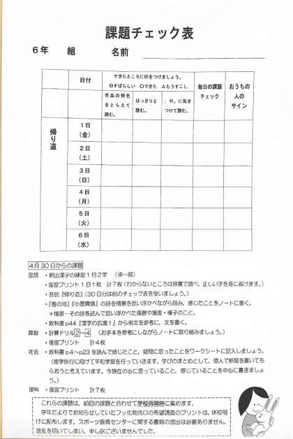 今回の配布した課題には,5月7日の分が含まれていません。チェック表にも7日の欄はありません。