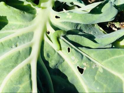 ゴールデンウィークがおわりました。この間見つけた青虫くんを見つけにいってみると…キャベツがあなだらけ!!!これはもしや…と思い,キャベツをながめていると,やっぱりいました青虫くん。連休前よりも大きく丸くなっているいんしょうでした。まわりにもフワフワとした毛が生えていて,キュートです。こんなにも大きくなったということは,このお休み中モリモリキャベツを食べたのでしょうね。