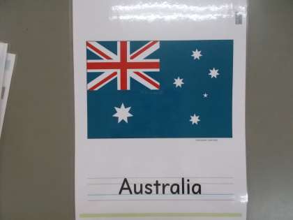 ちなみに先ほどのオーストラリアですが,国旗は見たことありますか?この写真です。知っている人も多いかもしれませんね。国旗のことも,勉強しますのでお楽しみに。そしてこの絵の下には…おやおや何やら英語で文字が書いてありますね。5年生から始まる外国語科で使うカードです。「Australia」で「オーストラリア」と読むんですね。