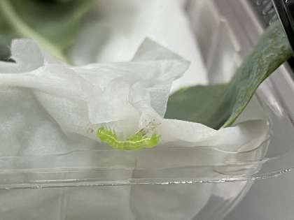 気になったのでとうめいの入れ物に入れて,かんさつをしていたのですが,青虫くんにとうめいのかわがはりついています!なにーーー!どうしたのーーー!??さっきまで元気にうごいていたのですが,じっとかたまっています。しんぱいです…
