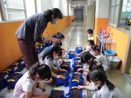 昨日は,1年生の学習相談日でした。少しずつの人数ですが,教室に集まった子ども達は,緊張の中にも嬉しそうな様子が見られました。いちばんはじめに,アサガオの種まきをしました。「水やりもするの。」「いつ芽がでるのかな。」とやる気満々の1年生でした。