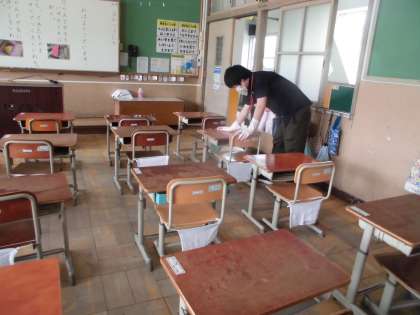 今日,使った教室の机や椅子,また触ったところを,消毒液で拭いて消毒しました。また明日,きれいになった教室で待っています。