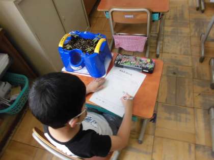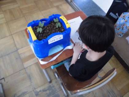 今日の3・4時間目に生活の学習でアサガオの観察をしました。色や形など細かいところに気を付けて観察シートに描きました。これからは自分たちで水やりをしてアサガオの成長を見守っていきます。