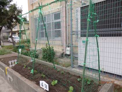 学校が始まり,みんなでかんさつしたツルレイシ。畑のツルレイシはずいぶん大きくなり,まきひげが伸び始めました。そこで,今日は畑にぼうを立て,ネットをはりました。どんな役割をすると思いますか。