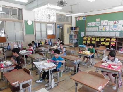 1年生にとっては,初めての給食。そして,新しい生活様式での給食。みんな前を向いて,飛沫が飛ばないように静かに食べました。Aグループ,Bグループ,食べた献立は違いますが,「おいしい。」と言っていました。次の献立も,楽しみですね。