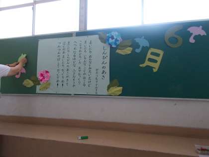5年生の掲示板を図工の荒木先生に6月らしくしてもらいました。飾りはもちろん,選んでいただいた詩も今の季節にピッタリです。