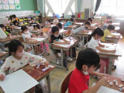 算数科では,いくつといくつの学習のまとめとして,「ブロックいれ」の活動を通していろいろな10の構成を考えました。おはじきの代わりにブロックをはじいて,円の中に入れます。10回はじいて,入った数と外れた数の色をぬります。この活動を通して,いくつといくつで10になるかを確認しました。楽しみながら,10の合成,分解を学習しました。