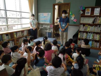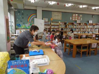 1年生は本の借り方を学びました。その後,本を1冊だけ借りました。表紙の絵を見て決めたり,以前に見た本を見つけたり,先生に助言をもらって決めたりしました。
