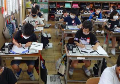 3年生になって毛筆の学習が始まりました。子どもたちは毎回この時間を楽しみにしています。最初は準備の仕方や道具の使い方の学習から始まり,いろいろな線を書く練習をしました。そして,今週は初めて「二」と書きました。「横画の筆使い」を確かめながら,ゆっくりていねいに書いていました。