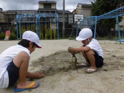 生活科と図画工作科の学習で,水で地面に絵を描いたり,砂場の土を掘ってトンネルを作ったりしました。子どもたちは,暑い中でしたが,夢中で土や水遊びの活動していました。こういった遊びの経験を通して,のびのび成長していってほしいと思います。