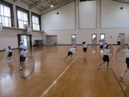 大きなフープを一人で転がしたり,友達に届くようにねらいを定めて転がしたりする活動をしました。また,棒を使ってバランスをとったり,棒が倒れるまでに2,3回手を叩いたりするゲームもしました。どちらの活動も用具をしっかり活用し,楽しく取り組めていました。