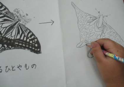 1組「アサギマダラの手紙」,2組「ぼくらは いけの カエル」,3組「ライオンの風をみた いちにち」です。お話を聞いて,どんな場面の絵を描こうか考え,お話に出てくる,蝶やカエル,ライオンを描く練習をしました。これから,どんな絵になるか,楽しみです。