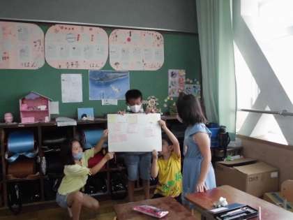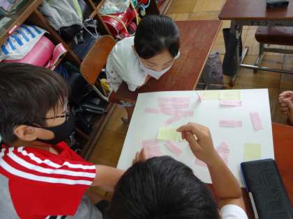 国語科の『山小屋で三日間すごすなら』の学習では,その三日間でしたいことを考え,ひつような持ち物をグループで話し合いました。ふせんを使って,考えや意見を整理したり,考えをいくつかにしぼったりなどしました。たがいの考えをみとめ合いながら,話し合いを進め,班で決まったことを全体に伝えることができました。