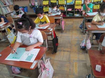 今日は,水書用筆の使い方を学習し,実際に水をつけて,線や文字を書く練習をしました。水書用筆は,鉛筆と同じ持ち方をしますが,力の入れ具合が難しいので,太い線になったり,途中で途切れたりします。子ども達は,新しい用具での学習を楽しみながら,真剣に取り組んでいました。