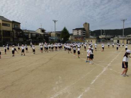 1年生は,体育参観に向けて,ダンスの練習をがんばっています。今週は,運動場で隊形移動に挑戦しました。「輪になって踊ろう」では,8つのグループに分かれて円になります。その後は,放射線状に隊形を変えます。みんなで心を一つにがんばります!