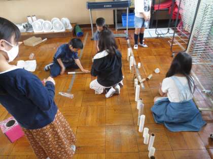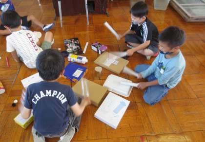 生活科「あそんで ためして くふうして」の学習で,お家でいらなくなった箱やカップなどを使って,いろいろな遊びをしています。