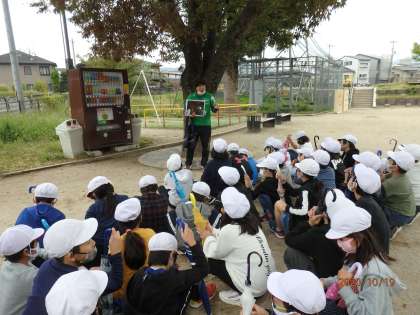 いつも遊んでいる公園にも,災害に備えたものがありました。まずは,自動販売機です。何気なく使用しているものですが,これも,もしもの時に役立つものでした。災害時に支援を受けることができる仕組みになっています。「災害時には誰でも利用することができるなんてすごい!」「食べ物の自動販売機も見たことがある。」と気付いている子もいました。