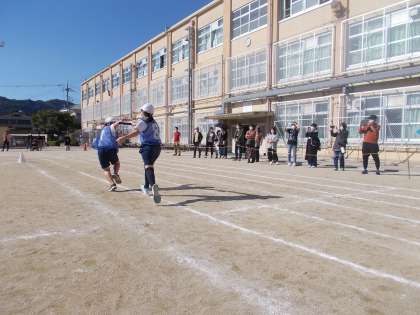 体育参観のメインは「リレー」でした。優勝はもちろんですが,子どもたちの中では練習の時から計ってきた自分たちのベストタイムを更新するという目標もあり,どのチームも一生懸命頑張りました。本番,タイムを更新したチームも多くあり,嬉しそうな様子が見られました。お互いを高め合いチームでがんばる楽しさに気付くことができたのではないでしょうか。いい走りができましたね!