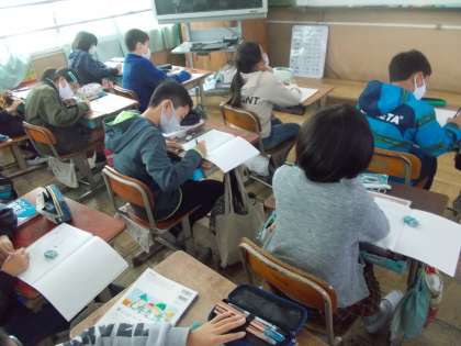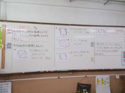 算数では今面積の学習をしています。これまでは長方形・正方形の面積しか求めることができなかった子どもたちですが…5年生では様々な形の面積を求める学習を行います。今回は平行四辺形の面積の求め方を考えました。線を引いて三角形に分けて考える子や,切って貼り付けて長方形にする子など様々なやり方がでてきました。既習の内容を活かして新しい問題にチャレンジする姿が見られています。