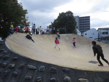 おさらの形のすべり台は,みんな大好きで,かけ上がったり,ごろごろ転がったりして楽しんでいました。
