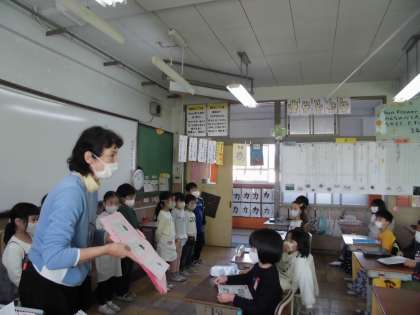 1年生がこの間の読み聞かせのおれいの手紙をとどけてくれました。1年生になって習った平が名,漢字を使い,一文字一文字心をこめて書いてくれたことが伝わるすてきなお手紙でした。手紙の中には,「また本を読みに来てほしいです。」「まっています。」などと書かれていて,3年生もその手紙をにこにことながめていました。がんばったかいがあったね。気持ちが伝わってよかったね。1年3組のお手紙は月曜日にとどけてもらえるそうです。お楽しみに!