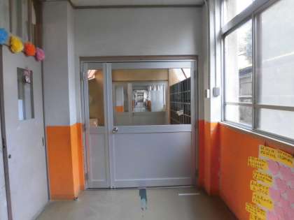 以前は片側しか開かない引き戸で,通りにくく混雑する場所でしたが,これで子どもたちが安全に通りやすくなりました。外の光もよく入って明るく感じます。