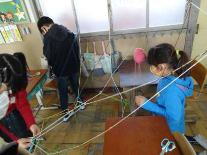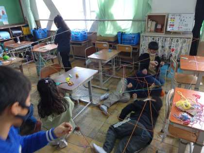 図画工作の時間に「ひもひもワールド」に取り組みました。カラフルなひもをつなぎ方や形,色の組み合わせなどを工夫しながら教室のいろいろな所に結んでいきました。やっていくうちにどんどん想像が膨らんできて,「こことここつなげよう。」「この色の方がいいな。」など友達と声を掛け合いながら楽しんで活動していました。最後にはみんなで見て回り,「いつもの教室とは違う場所みたい。」と満足した様子で眺めていました。