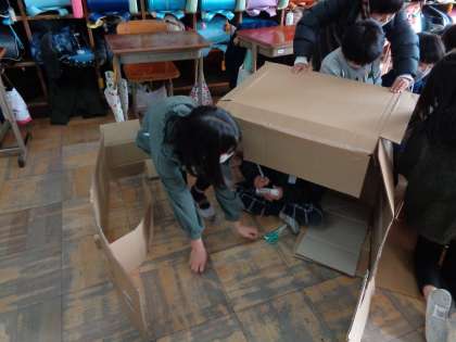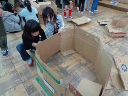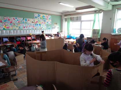 子どもたちは,段ボールを切って広げてみたり,家みたいに囲んで屋根を作ってみたりと体全体を使って作っていました。