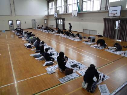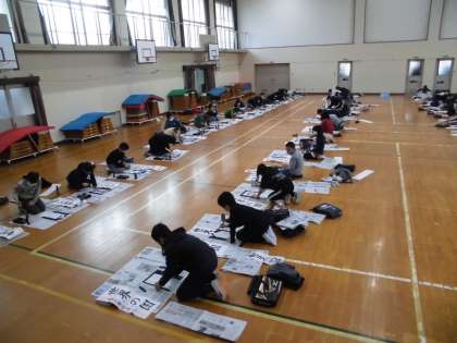 先日,体育館にて学年合同で書き初め大会をしました。書き初めは平安時代から行われてきた歴史ある行事です。自分の字と向き合い,今年一年しっかりとした字が書けるように願いをこめて書くんだよという話を聞いてから,行いました。子どもたちはとても集中して,しっかり練習をしていました。いつもとは違う画仙紙に書く難しさを感じている子たちも見られましたが,ゆっくりと丁寧に自分の字と向き合って書くことができました。
