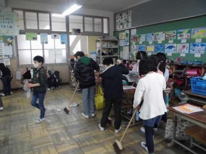 そうじの様子です。教室そうじは,ほうき,下ぞうきん,机ひき,上ぞうきん・整理など,それぞれの班が自分たちのそうじの役わりを一生けんめいにこなしています。ほうきの当番が一列になって,ゆかをはくと,「ぞうきんさんお願いします。」,ぞうきんの当番がふき終えると,「机ひきさん,2列目どうぞ。」などとれんけいプレーもばっちりです。きょう力し合いながら,そうじを進められ,教室はピカピカにきれいになっていました。子どもたちを見ていて,教室だけでなく,たんにんの心もすっきり,きれいになりました。