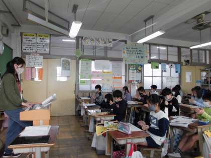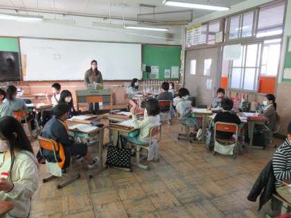 音楽の授業では,四分音符と八分音符を組み合わせてリズムづくりをしました。自分の作ったリズムを順番に回して手拍子で会話をしたり,班の友だちと協力して全員がぴったりリズムをそろえることに挑戦したりしました。