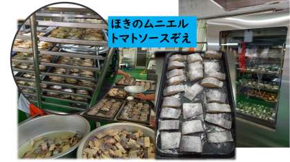 ほきは,深海にすむ白身の魚です。給食室では,塩・こしょう・料理酒で下味をつけ,サラダ油をからめ,米粉をかけてスチームコンベクションオーブンでスチームと熱風で焼いていきました。